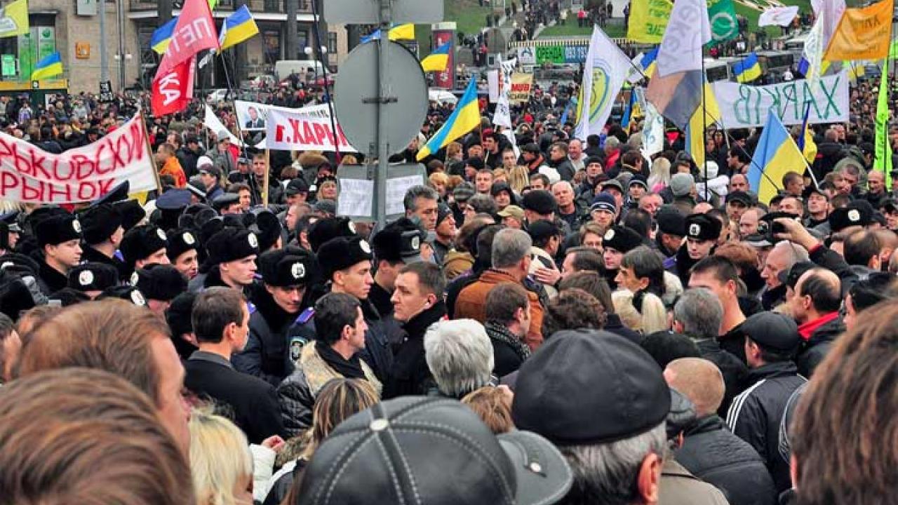 I dagarna sex år efter den organga revolutionen samlas åter demonstranter på Självständighetstorget i centrala delarna av huvudstaden Kiev. Kravet är att den nya skattelagstiftningen som antogs av parlamentet i förra veckan stoppas eftersom den enligt demonstranterna höjer skatterna för egenföretagare och i ökad utsträckning utsätter dem för korrupta skattehandläggares godtycke.