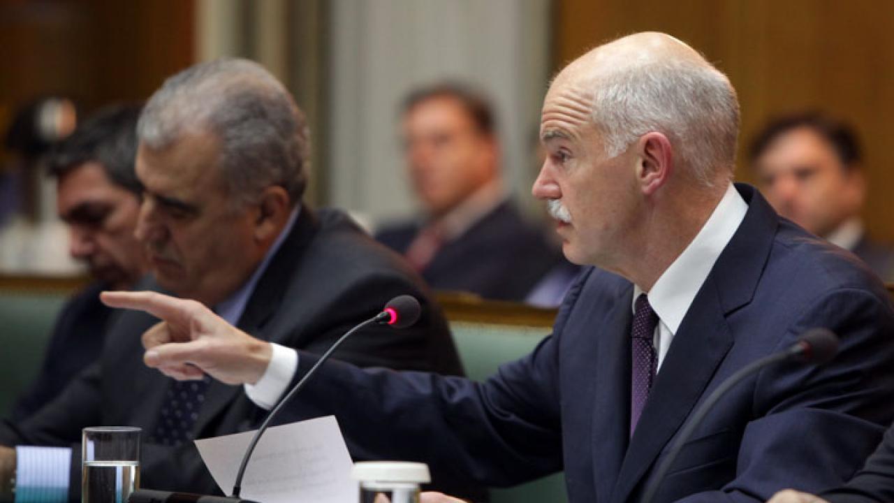 Under lunch sitter den grekiske premiärministern i ett krismöte med sin regering. Motståndet mot hans plan att låta folkomröstningen bli en omröstning om huruvida Grekland ska stanna kvar i euron har lett till revolt i hans egen regering. Flera parlamentsledamöter kräver nu Papandreous avgång, rapporterar BBC.
